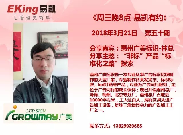 2018年3月21日《周三晚8点-易凯有约》第五十期由惠州广美标识林总分享,分享主题是:“非标”产品“标准化之路”探索。